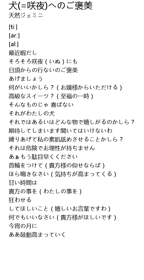 | [01:38.10] | 何でもいいなさい(貴方様がほしいです) |