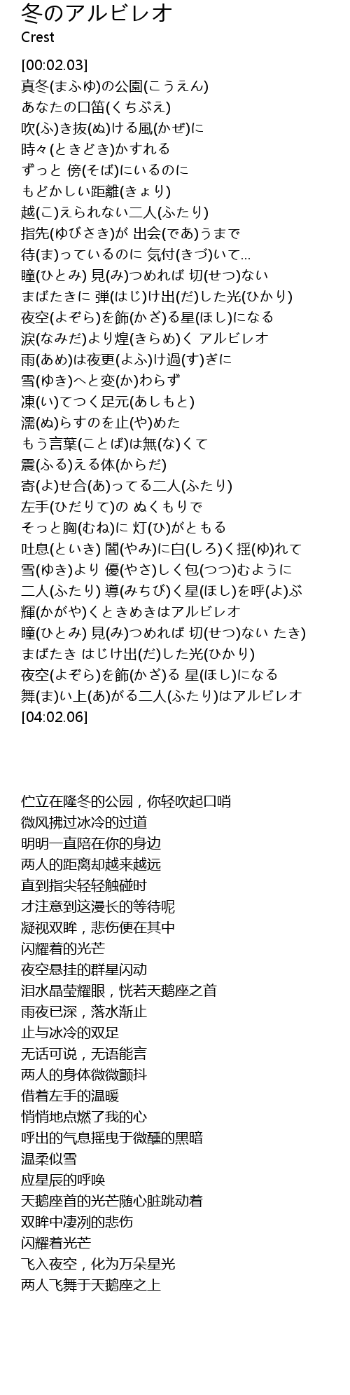 | [01:42.23] | 涙(なみだ)より煌(きらめ)く アルビレオ |