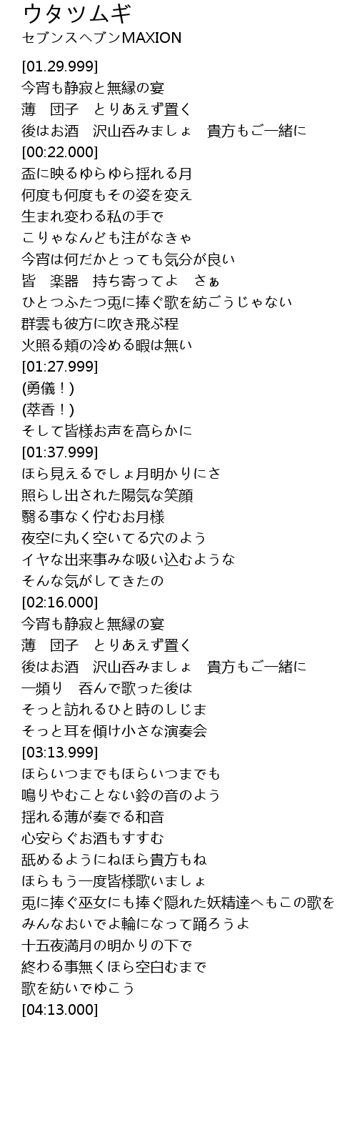 | [03:42.000] | 兎に捧ぐ巫女にも捧ぐ隠れた妖精達へもこの歌を |
