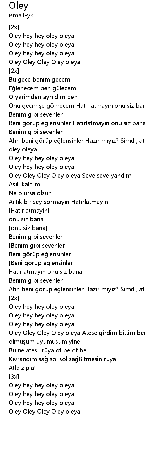 | Oley Oley Oley Oley oleya Ate e girdim bittim ben bu gece mi sarho olmu um uyumu um yine | |