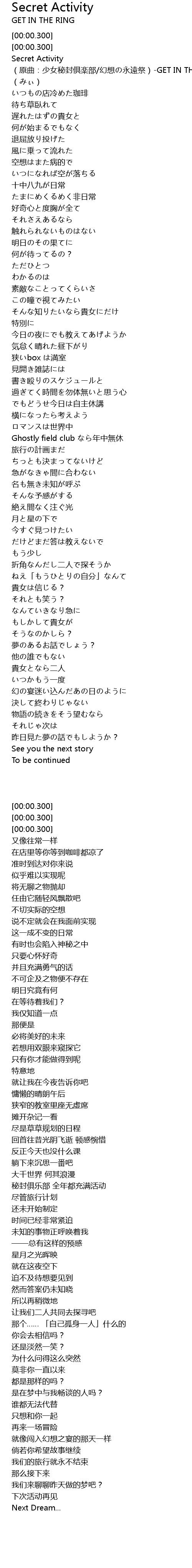 | [00:00.300] | Secret Activity yuan qu: shao nv mi feng ju le bu huan xiang yong yuan ji GET IN THE RING |