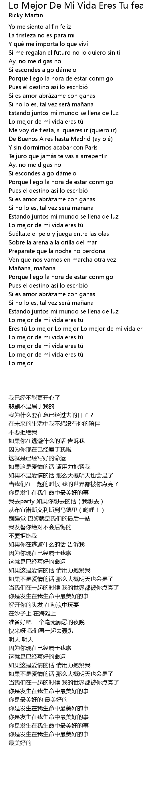 | [02:54.42] | Eres tú Lo mejor Lo mejor Lo mejor de mi vida eres tú |