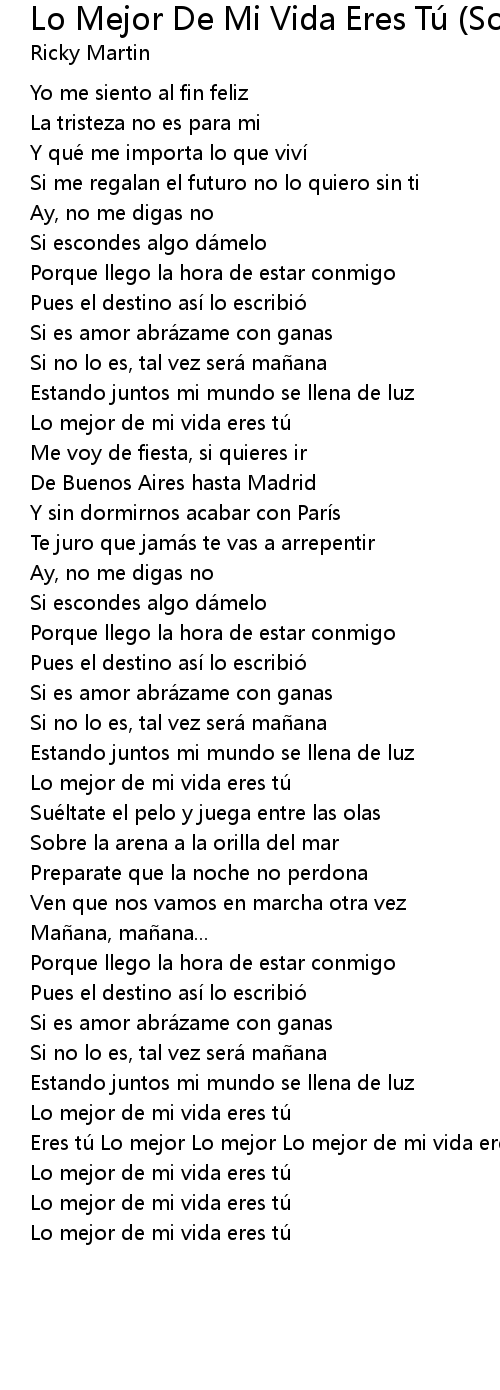 | [02:54.42] | Eres tú Lo mejor Lo mejor Lo mejor de mi vida eres tú |
