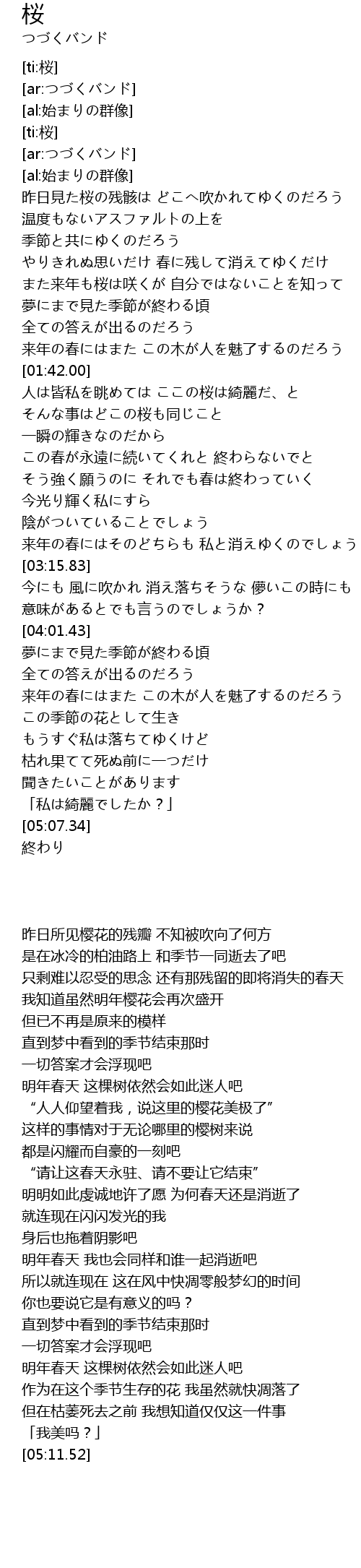 | [00:23.00] | 昨日見た桜の残骸は どこへ吹かれてゆくのだろう |