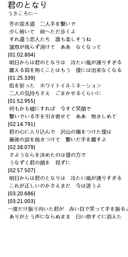 | [00:21.381] | 冬の並木道 二人手を繋いで |
