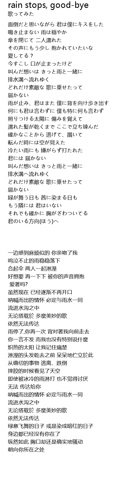 | [04:33.89] | 叫んだ想いは きっと雨と一緒に |