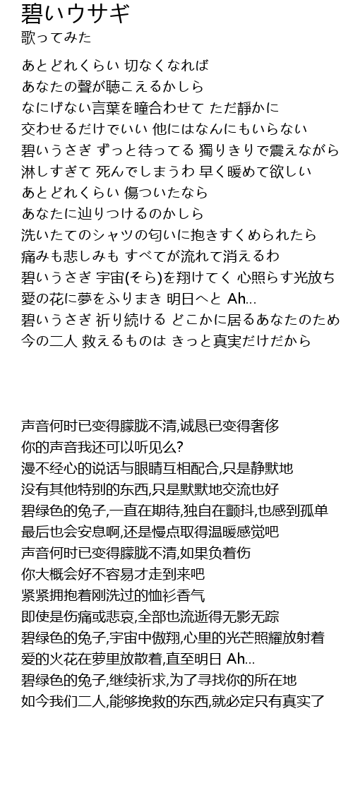 | [01:37.72] | 碧いうさぎ 祈り続ける どこかに居るあなたのため |