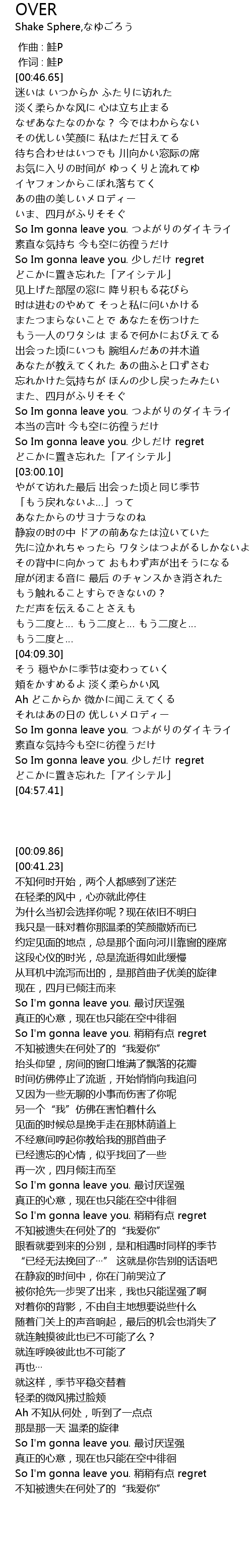 | [04:46.38] | So Im gonna leave you. 少しだけ regret |