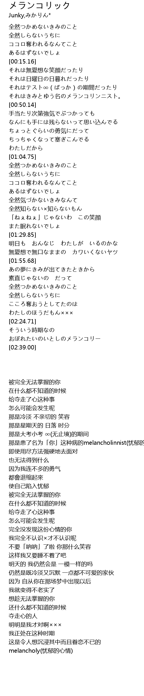 | [00:43.82] | それはきみとゆう名のメランコリンニスト。 |