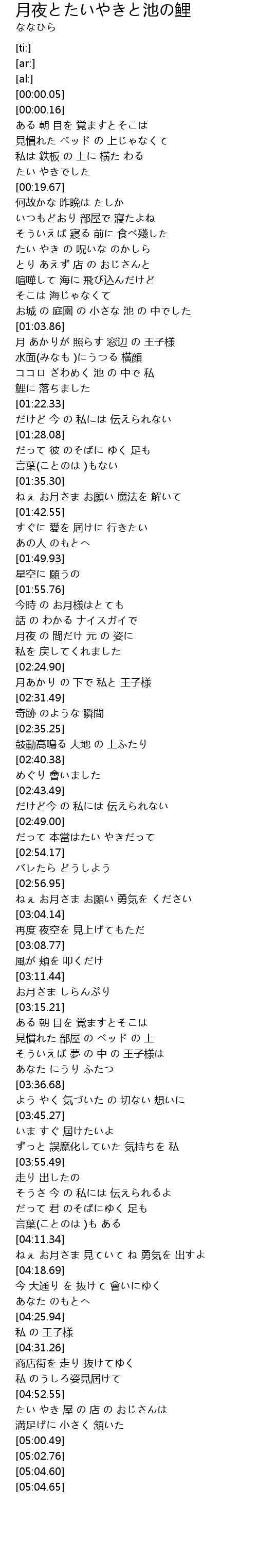| [00:44.95] | たい やき の 呪いな のかしら |