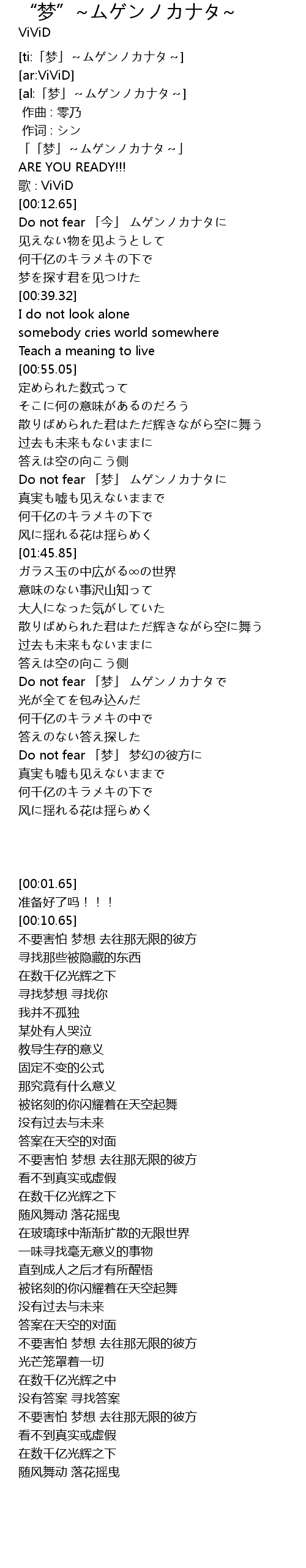 | [00:01.65] | 「「梦」~ムゲンノカナタ~」 |