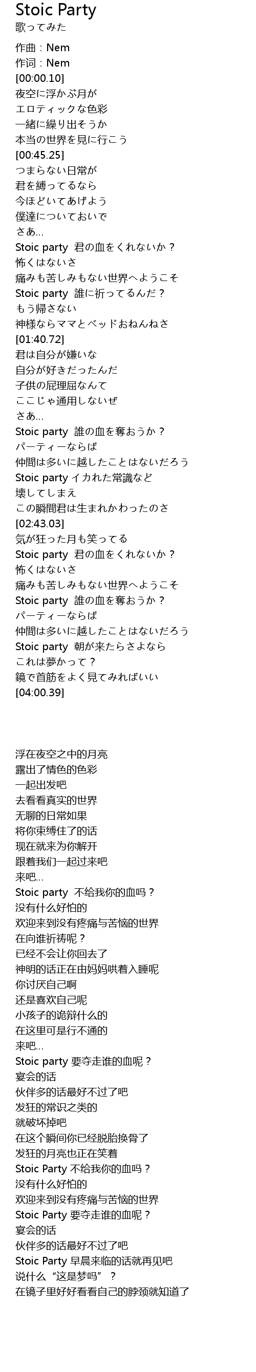 | [01:09.79] | Stoic party 君の血をくれないか? |