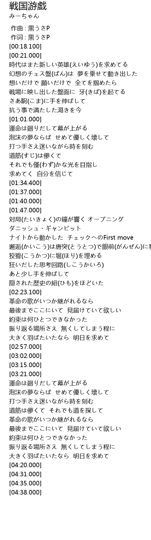 | [00:32.500] | 幻想のチェス盤(ばん)は 夢を乗せて動き出した |