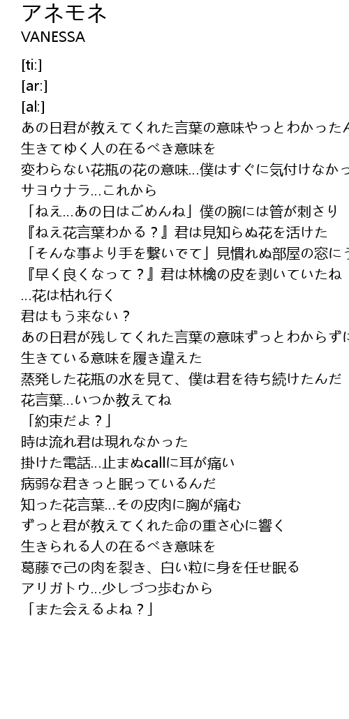 | [01:31.85] | 『ねえ花言葉わかる?』君は見知らぬ花を活けた |