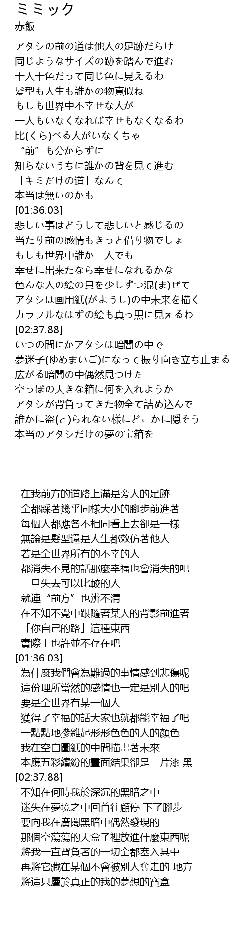 | [00:49.40] | 髪型も人生も誰かの物真似ね |