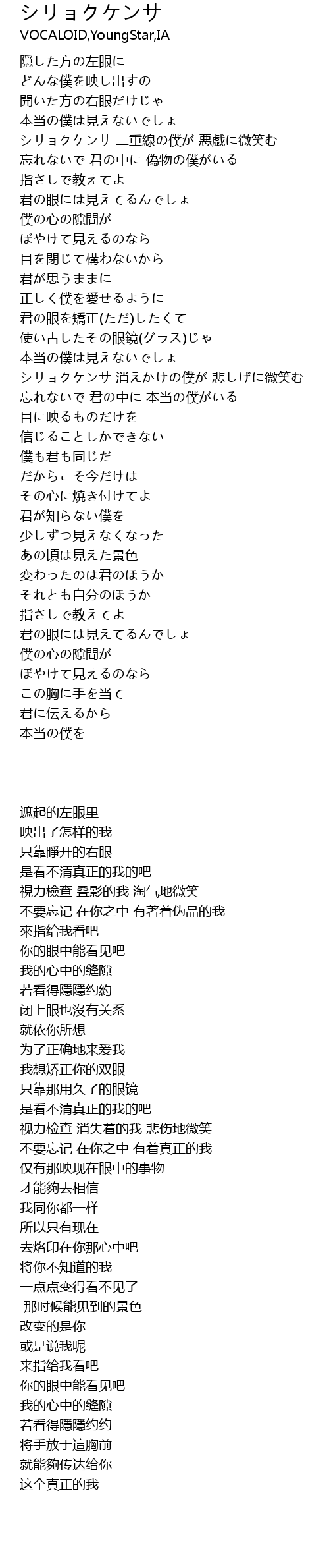 | [02:39.32] | シリョクケンサ 消えかけの僕が 悲しげに微笑む |