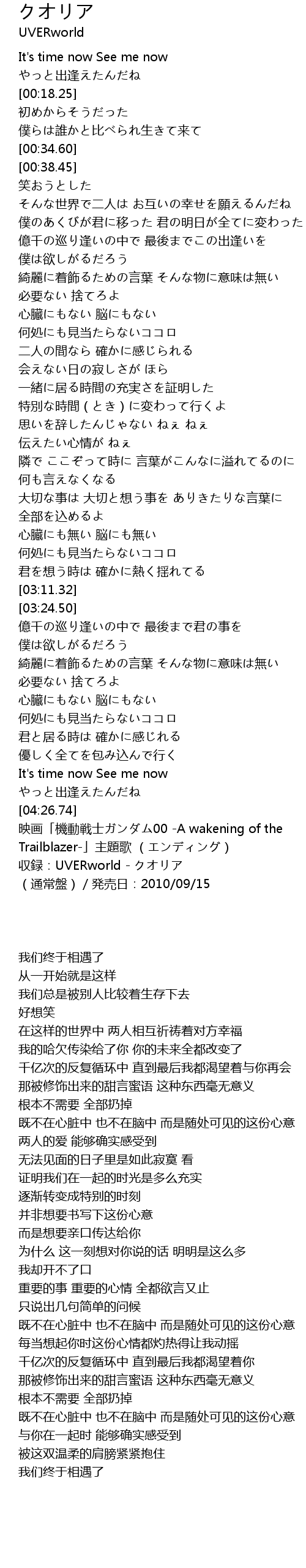 | [04:38.74] | 収録:UVERworld - クオリア (通常盤)/発売日:2010/09/15 |