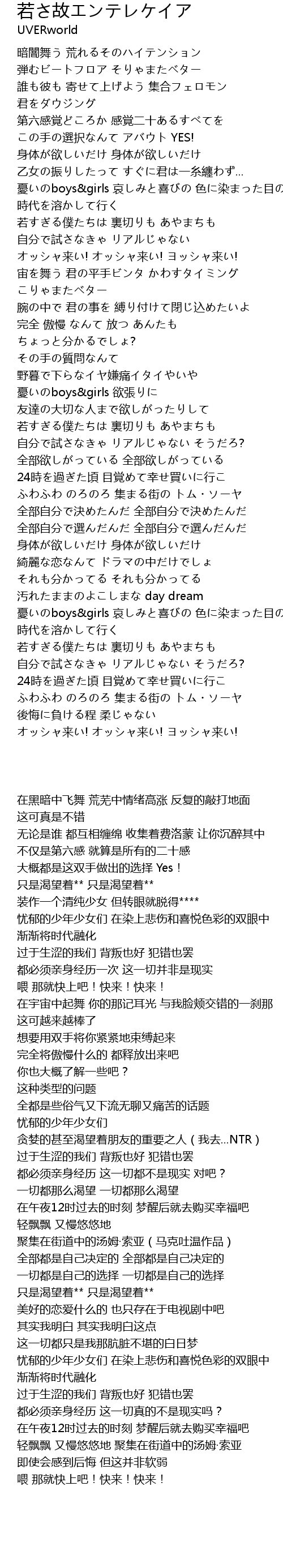 | [03:36.390] | 憂いのboys&girls 哀しみと喜びの 色に染まった目の中 時代を溶かして行く |