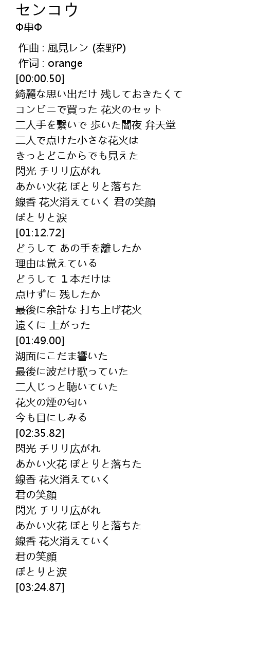 | [02:41.68] | あかい火花 ぽとりと落ちた |