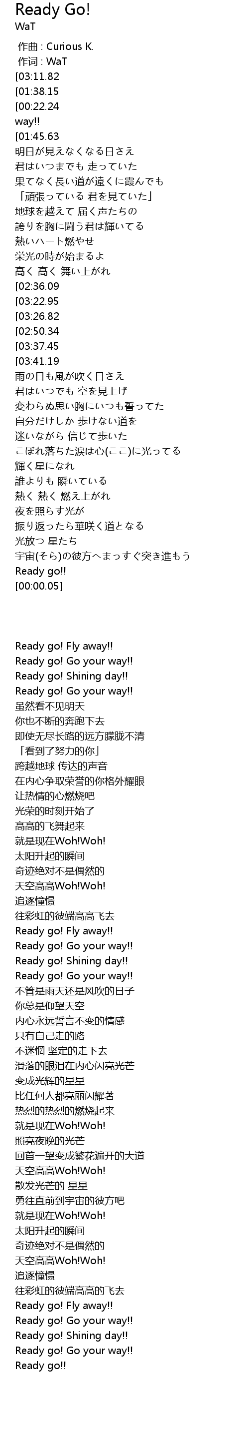 | [00:11.49][01:38.15][03:48.62] | Ready go! Fly away!! |