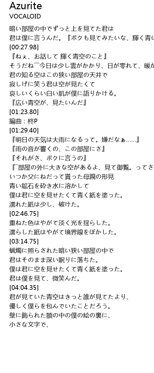 | [00:15.23] | 君は僕に言うんだ。『ボクも見てみたいな、輝く青い空――』 |