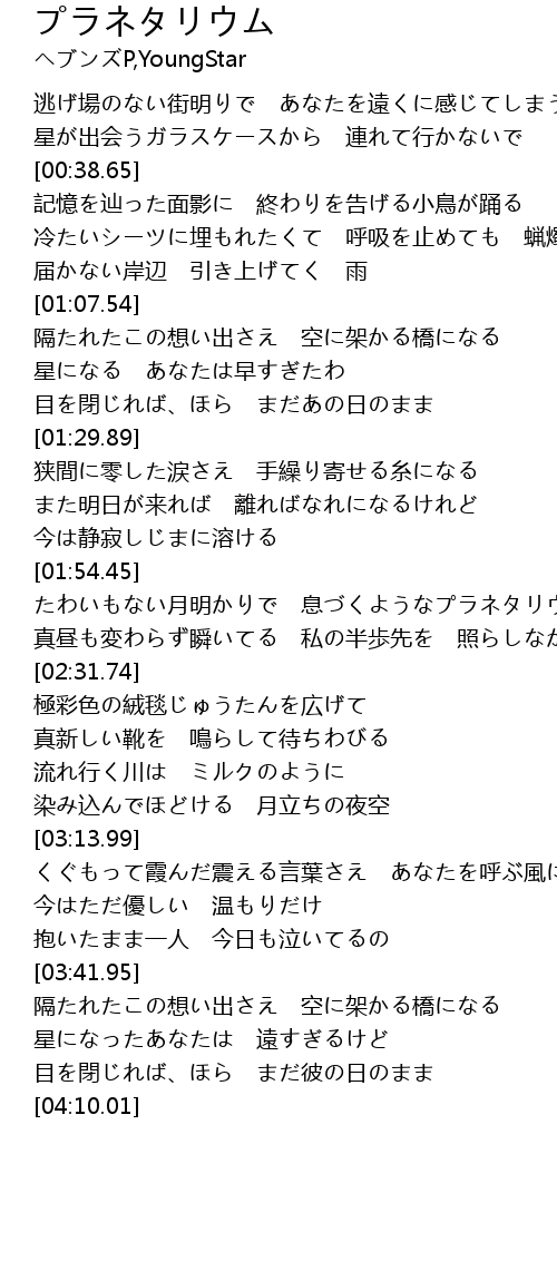 | [02:09.05] | たわいもない月明かりで 息づくようなプラネタリウム |