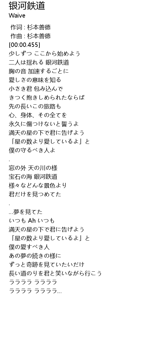 | [00:37.296] | 二人は揺れる 銀河鉄道 |