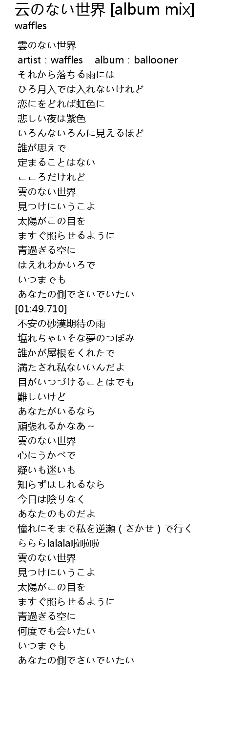 | [03:07.997] | 憧れにそまで私を逆瀬(さかせ)で行く |