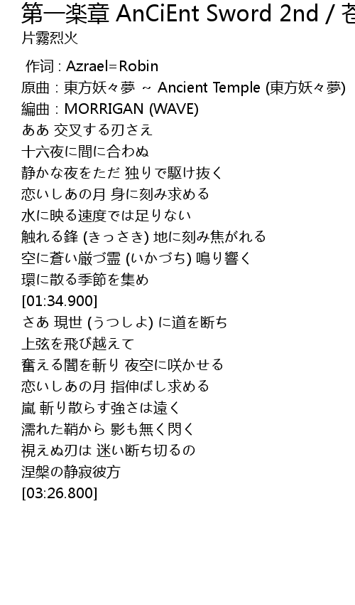 | [00:01.200] | 原曲:東方妖々夢 ~ Ancient Temple (東方妖々夢) |