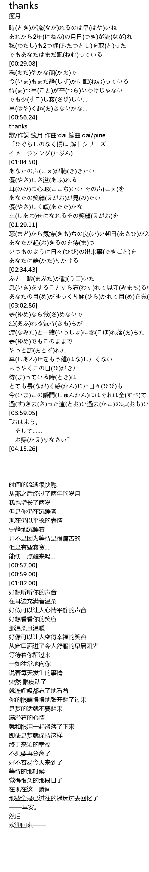 | [00:59.00] | 歌/作詞:癒月 作曲:dai 編曲:dai/pine |