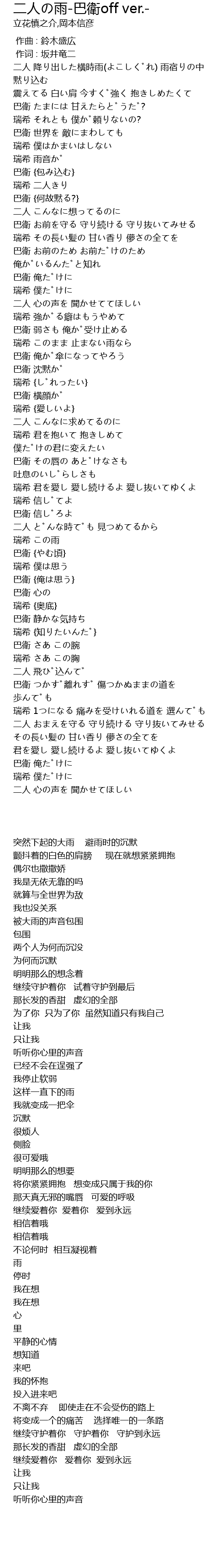 | [01:38.433] | 巴衛 弱さも 俺が受け止める |