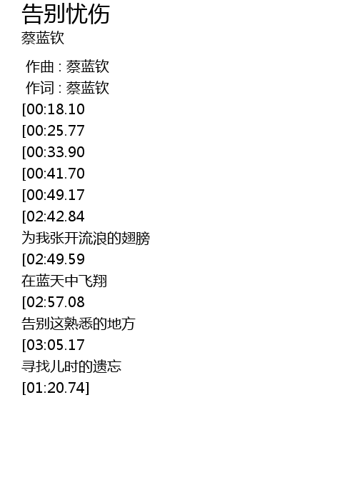 | [01:39.17][00:18.10] | 告别了我的忧伤 我要出发到远方 |