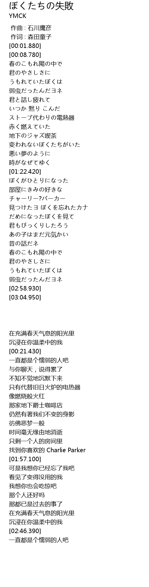 | [02:00.120] | 見つけたヨ ぼくを忘れたカナ |
