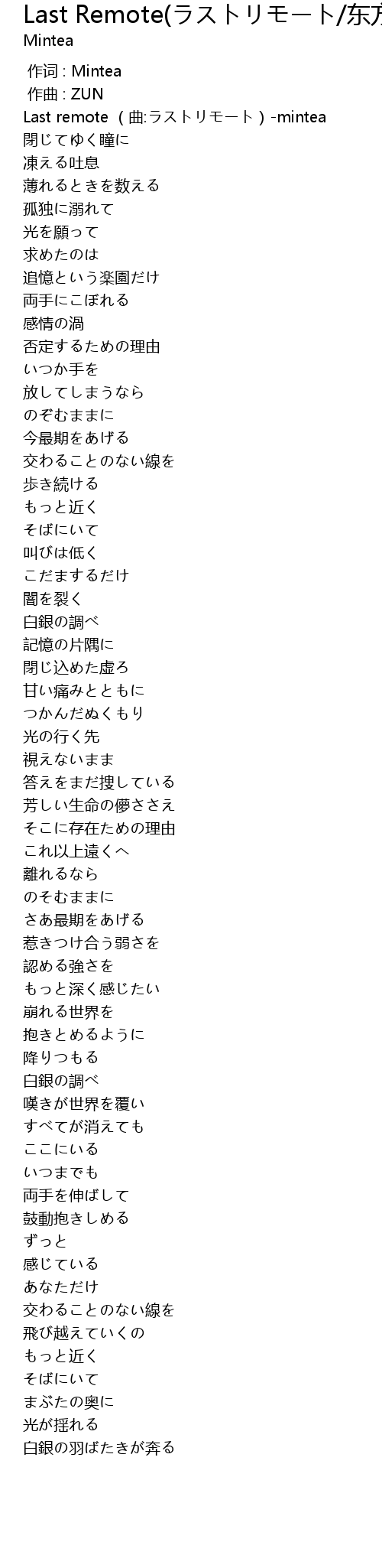 | [00:00.00] | Last remote (曲:ラストリモート)-mintea |