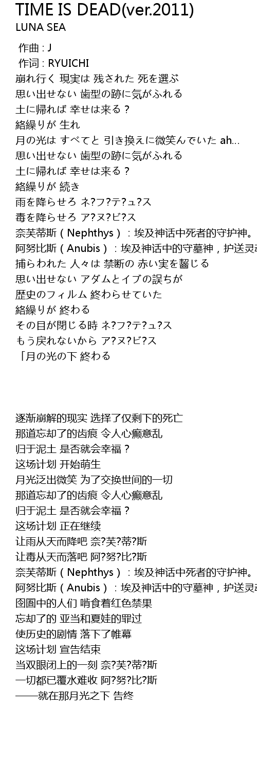 | [02:13.800] | nài fú dì sī Nephthys: āi jí shén huà zhōng sǐ zhě de shǒu hù shén. |