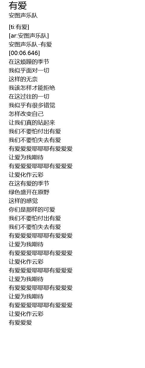 | [01:13.282] | 有爱爱爱耶耶耶有爱爱爱 |