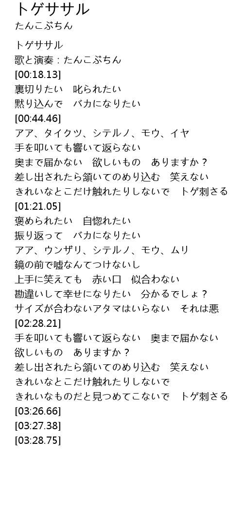 | [03:18.44] | きれいなものだと見つめてこないで トゲ刺さる |
