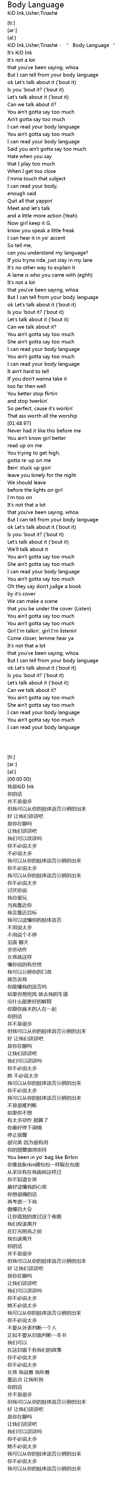 | [00:00.00] | KiD Ink, Usher, Tinashe '' Body Language'' |