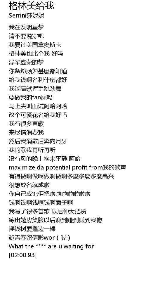 | [00:24.63] | gěi wǒ qián a míng lì shén me dōu hǎo |