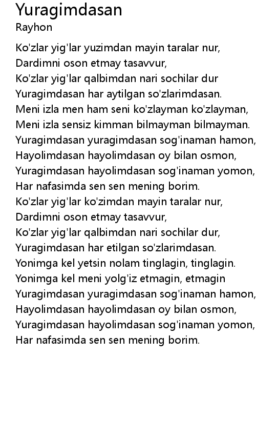 | Yuragimdasan har aytilgan so'zlarimdasan. | |