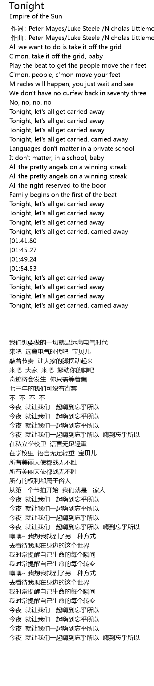 | [00:53.91] | Tonight, let' s all get carried, carried away |