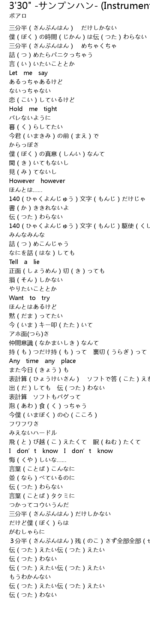 | [03:09.18] | 3分半(さんぷんはん)残(のこ)さず全部全部(ぜんぶぜんぶ) |