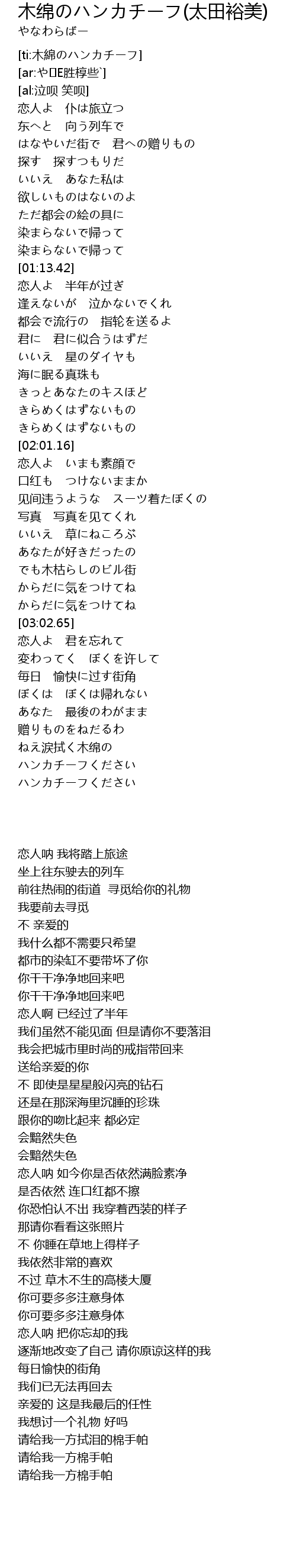 | [00:33.51] | はなやいだ街で 君への赠りもの |