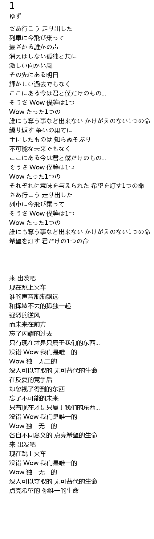 | [01:33.520] | そうさ Wow 僕等は1つ |