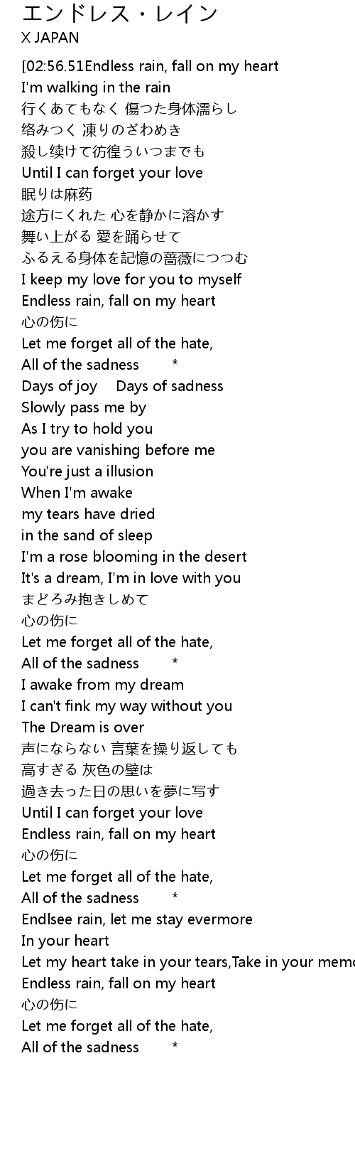 | [05:30.76] | Endlsee rain, let me stay evermore |