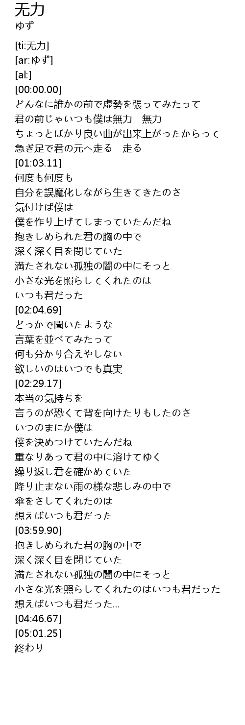 | [00:28.52] | 君の前じゃいつも僕は無力 無力 |