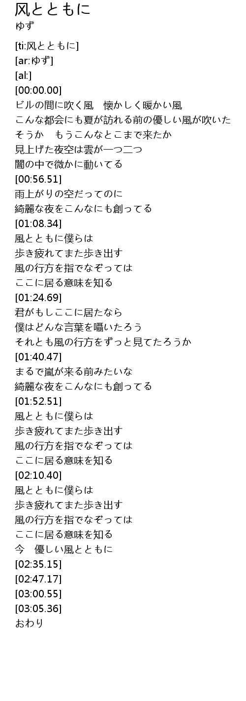 | [00:32.03] | こんな都会にも夏が訪れる前の優しい風が吹いた |