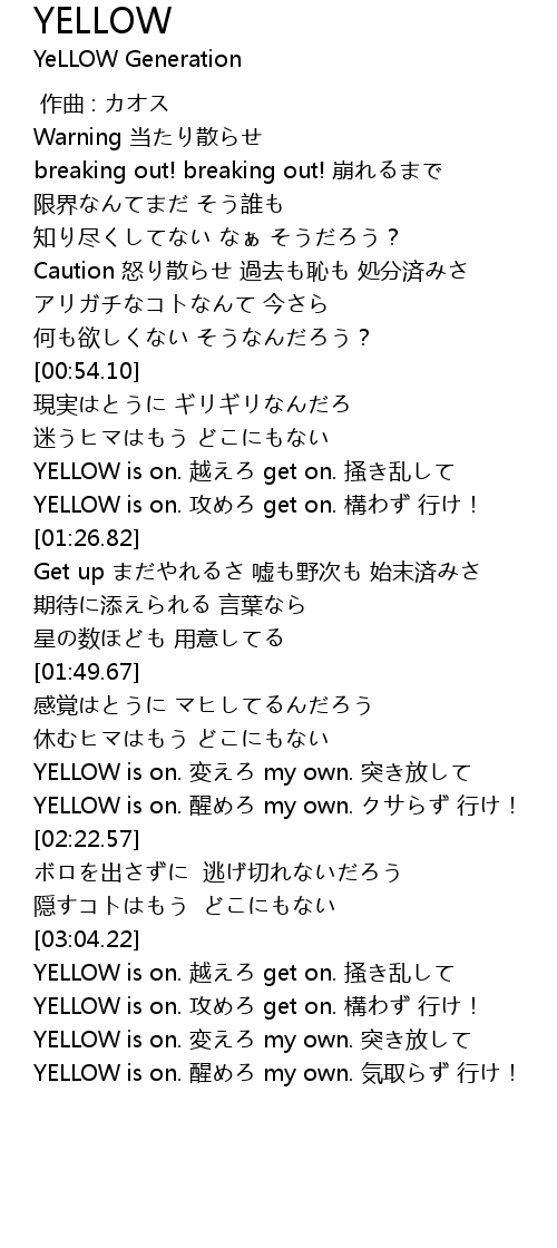 | [03:40.94] | YELLOW is on. 醒めろ my own. 気取らず 行け! |