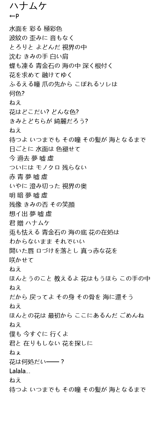 | [04:15.41] | ほんとの花は 最初から ここにあるんだ ごめんね |