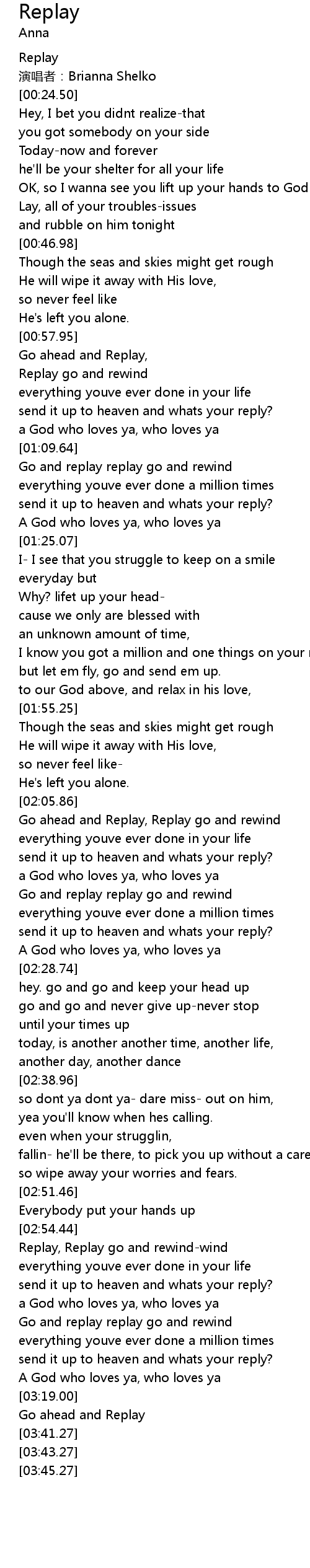 | [03:05.48] | Go and replay replay go and rewind |